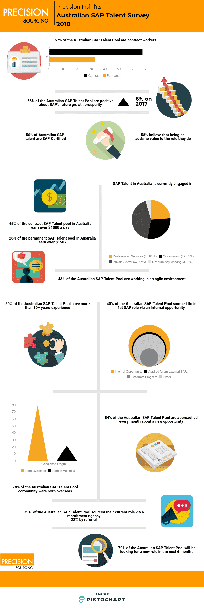 We recently conducted a survey of the local SAP talent pool here in Australia. Thank you to everyone who contributed to the survey. You have helped us to gain specific insight into the SAP market. If you have any questions please contact: sap@precisionsourcing.foundrydigital.com.au